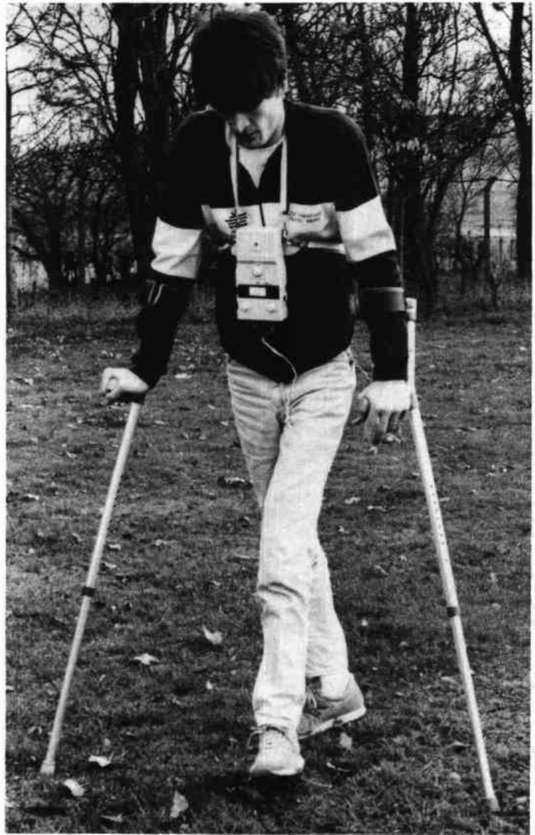 Five patients with incomplete spinal cord lesions have so far been included in the program of FES assisted walking. Only a short strengthening program was required for disuse atrophy of their thigh muscles. The learning program of walking was extremely fast and simple. After the first few days the patients were able to go from mobile parallel bars to crutches (Fig. 1). The difference between walking with and without FES was evident. The patients were not able to take a single step with their severely paralyzed extremity when the stimulator was switched off. After a few days of training they were able to rise from the sitting to the standing position independently with the help of the crutch support and knee extensor stimulation only. Soon they were able to walk on uneven ground (Fig. 3) and go up and down steps (Fig. 2). The subject shown in Fig. 3 has an incomplete lesion at the level T6/7 (age 36 yrs., height 168 cm., mass 61 kg., 7 yrs. post injury). The subject shown in Fig. 1 and Fig. 2 has an incomplete lesion at the level C6 (age 21 yrs., height 188 cm., mass 70 kg., 3 yrs. post injury). In both cases one leg was paralysed while the other had sufficient voluntary control to maintain safe standing with crutches without stimulation.
